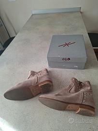 Stivaletti bassi in camoscio color sabbia con suola in cuoio e gomma. Chiusura con comoda cerniera. Con borchie color acciaio. In perfette condizioni ed usate davvero poco ed ottimamente conservate nella sua scatola originale.