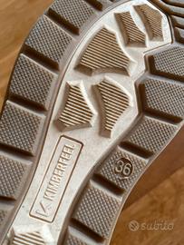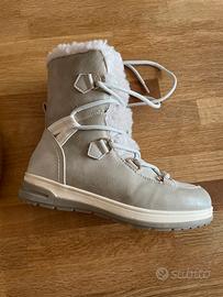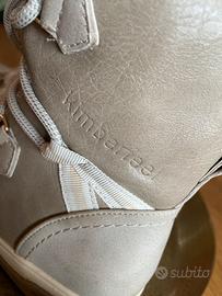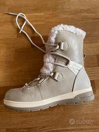 bellissimi stivaletti invernali marca Kimberfeel, colore beige/tortora, ideali per affrontare freddo e neve con stile e comfort. Interno completamente rivestito in morbida pelliccia sintetica, molto calda e confortevole. Esterno resistente tipo eco-pelle/scamosciato, con suola antiscivolo perfetta anche per giornate piovose o fredde. Chiusura con lacci e dettagli dorati. Scarpe pratiche, calde e versatili, perfette sia per la montagna che per l’uso quotidiano in città. Usate pochissimo, in condizioni eccellenti (come da foto).