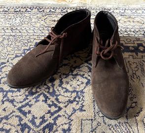 Eleganti stivaletti scamosciati di colore marrone scuro, marca Kroll. Modello alla caviglia con chiusura a lacci.