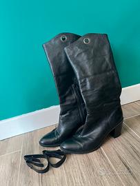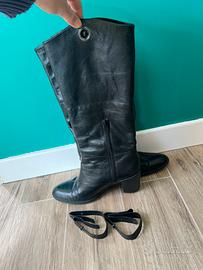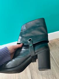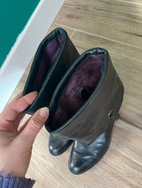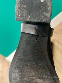 Bellissimi stivaletti con tacchetto circa 5 cm, presenza di cinghie che passano sotto la suole che si possono, volendo, anche togliere e portare lo stivaletto alto a metà polpaccio.