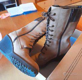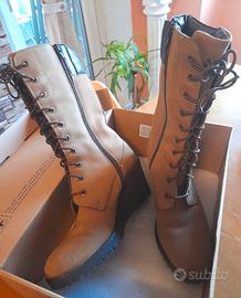 Stivaletti Lumberjack donna, originali, scamosciati color biscotto con inserti in pelle testa di moro, altezza 30 cm. metà polpaccio, zeppa 7 cm. Foderati e caldi, autunno/inverno. mis. 37. Pochissimi segni praticamente nuovi, suola compresa. Sconto se ritiro a domicilio (Milano)