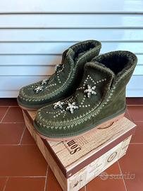 Vendo raffinati stivaletti Mascotte realizzati in vera pelle scamosciata color verde oliva,