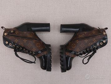 Stivaletto Star Trail Monogram Louis Vuitton in tela Monogram, dettagli in pelle di vitello nera e lacci in cuoio nero. Zip laterale apribile. Altezza tacco 10 cm comprensivo di plateau di 2 cm. Taglia 39. Dotate di box, e sacchetto in tessuto da usare per riporle quando non si usano o in viaggio. Indossate tre volte. In regalo addizionale paio di lacci di ricambio in cuoio nero. Attuale prezzo di vendita: 1.420 € (nei negozi Louis Vuitton in Italia). Si allegano inoltre foto di box originale, custodie originali e dettagli che ne certificano l’autenticità, compreso il codice identificativo interno (MA0i 38). Non dispongo della ricevuta di acquisto perché è un regalo.