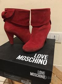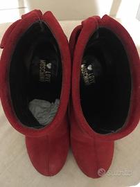Stivaletti donna numero 36 marca Love Moschino originali, utilizzati poco e conservati in buone condizioni con scatola e incarto originale. Materiale camoscio, colore rosso, punta arrotondata e fiocco posteriore. Altezza tacco 8 cm. Altezza gambale 10 cm. Vendo per inutilizzo.