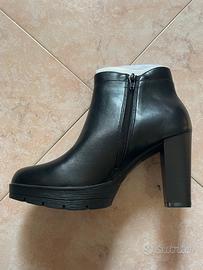 STIVALETTI MAI UTILIZZATI, NUOVI ANCORA IN SCATOLA. Eleganti stivaletti neri da donna, perfetti per completare il tuo look con stile. II tacco alto da 8,5 cm dona un tocco di eleganza e temminilita, mentre la tomaia in pelle liscia assicura comfort e durata. Ideali per serate speciali o per aggiungere un tocco sofisticato al tuo outfit quotidiano. La chiusura con zip laterale facilita la calzata. Un modello versatile che ti accompagnerà con classe in ogni occasione!