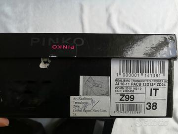 Stivaletti tronchetti neri in pelle scamosciata, marca Pinko, n. 38, foderati in pelle, fibbia in pelle nera e tacco cromato alto 10 cm e largo 1 cm, decorazione cromata sul retro con marchio. Suola larga 8 e lunga 21 cm, tronchetto alto 10 cm dalla caviglia all'inizio del tacco. In ottimo stato, anche nella fodera, lievi segni sui tacchi come in foto, piccolo segno sulla decorazione cromata come in foto, qualche lieve segno di usura sulla tonia in punta e sull'esterno come in foto, sostituita parte della suola originaria con antiscivolo in gomma in ottimo stato. Con scatola originale 31x29x10 cm.