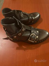 Stivaletti neri dal look rock/punk, arricchiti da cinghie con fibbie metalliche e occhielli decorativi. Suola resistente e zip laterale per una calzata comoda. Ideali per outfit grintosi e casual. In ottime condizioni, con minimi segni d’uso.