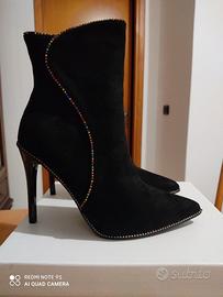 Stivaletti neri in ecopelle effetto nabuk con strass colorati sui bordi, n.37, tacco a spillo cm 10. Nuovi, mai indossati.