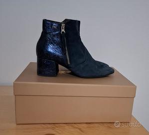 Tronchetti donna Nero Giardini a punta, colore blu, in due materiali diversi: davanti in camoscio e la parte posteriore in pelle Rock Militare. Numero 39, tacco comodo 5 cm, chiusura lampo sui lati esterni.