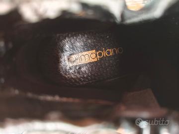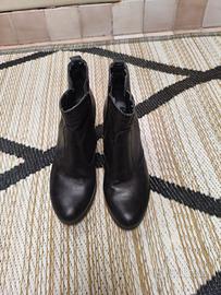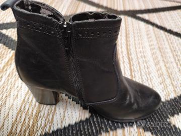Prezzo trattabile Vendesi stivaletti neri marca Primopiano, realizzati in vera pelle con bellissimi dettagli traforati stile "Brogue". Sono scarpe molto solide, dotate di un tacco largo che le rende estremamente comode per camminare tutto il giorno e una suola in gomma a carrarmato ideale per la pioggia e l'inverno. Chiusura rapida con zip laterale perfettamente funzionante. Esterno: La pelle è ben conservata, senza graffi profondi. Interno: Segnalo che il rivestimento sintetico del bordo superiore interno si sta spellando, Il difetto è visibile solo a scarpa sfilata e non ne pregiudica l'uso, ma ho abbassato il prezzo per questo motivo. Ottime come scarpa quotidiana per l'ufficio o il tempo libero.