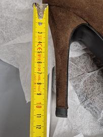 Vendo stivaletti scamosciati a tacco alto. Nuovi e mai usati (come si vede dalla suola) e con tacchetto in gomma.