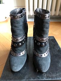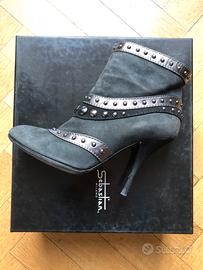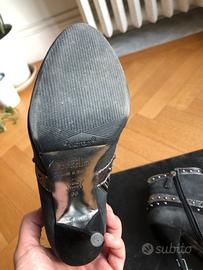 Eleganti stivaletti con un design audace e dettagli metallici. - Materiale scamosciato nero. - Fasce decorative con borchie. - Dettagli a contrasto in argento. - Zip laterale per facilitare la calzata. - Scatola e dust bag originali. - Appena rifatti suole e tacchi. - Piccoli graffi sulle pelle dei tacchi (vedi foto).