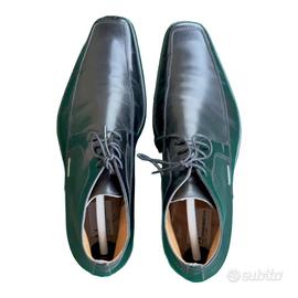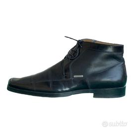 Stivaletti stringati da uomo Moreschi in pelle nera, modello alla caviglia dal profilo affusolato con punta squadrata. Tomaia in pelle liscia con cuciture in evidenza lungo la punta e il lato, piccolo logo metallico Moreschi esterno, interno foderato in pelle chiara e tacco basso classico, lavorazione artigianale Made in Italy, una scarpa elegante ma discreta, perfetta per ufficio, cerimonie o look cittadini più formali. Usati in ottime condizioni: nessun difetto strutturale. Colore e stato reali sono ben visibili nelle foto dell’annuncio.