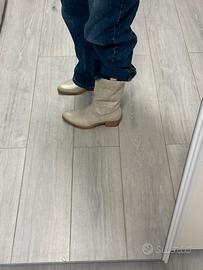Stivaletti texani Dame Rose colore bianco panna con ricami decorativi in stile western. Tacco comodo effetto legno, modello a punta, perfetti per look boho, festival o outfit primaverili/estivi.