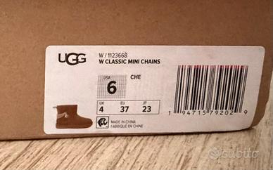 Stivaletti Ugg in camoscio marrone con dettagli in catena dorata.
