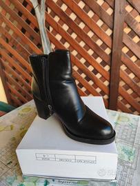 Elegante stivaletto nero con particolare rifinitura a rilievo, punta tonda, tacco medio spesso, chiusura a zip laterale, molto comodo.. praticamente nuovo