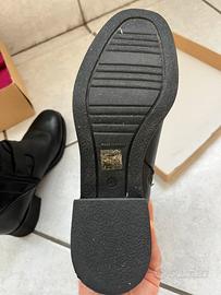 Confortevole stivaletto (h. cm. 22, compreso il tacco) in pelle nera, usato pochissime volte, con cinturino e fibbia laterale, tacco cm. 5, suola in gomma spessa.