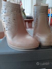 Comodo stivaletto, tacco 8 cm.con piccolo plateau di 1 cm. Color tortora, zip sul retro, traforato come da foto, usati pochissime volte, praticamente nuovi.