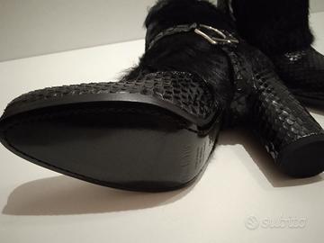 Questo è un paio di stivaletti Gianni Barbato in pelliccia nera e pelle con stampa pitone, con fibbia con logo in metallo argentato, con custodia e sottotacco di ricambio