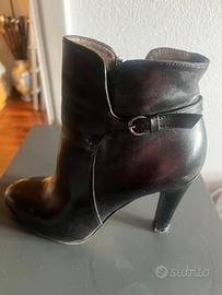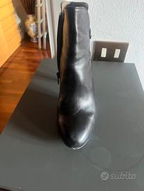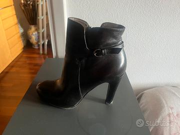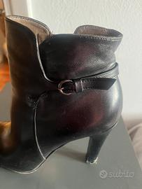 Stivaletto nero in pelle con tacco alto .misura 39 ma in realta ‘ e’un 38 .A lato si vede un cinturino.