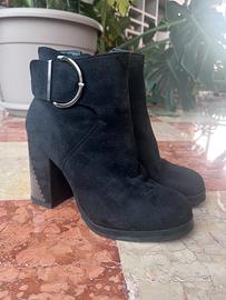 Stivaletto scamosciato con fibbia argentata e dettaglio argentato sul tacco largo di altezza circa 8 cm. Usato 1 volta.