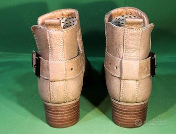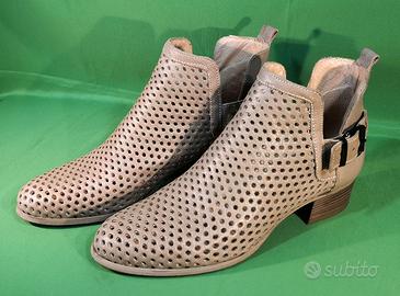 Stivaletto traforato in pelle marca Barca, made in Italy, con chiusura a fibbia, colore beige, taglia 39, tacco cm.4, interno foderato nel tallone e sfoderato nel dorso, suola e tacco in gomma, con propria scatola. Scarpe leggere e fresche, ideale per primavera-estate. Usate 2 volte in perfetto stato come ben visibili in foto, si cedono per crescita, no scuciture, strisci, tagli, odori o parti mancanti. Molte altre foto disponibili in chat. Preferisco scambio a mano, previa visione, in zona Mestre, Marghera, Dolo, Mirano, Mogliano Veneto, Treviso-Sud, Venezia (P.le Roma) o comuni limitrofi. Spedisco velocemente solo con Tutto Subito con doppia scatola. In questo caso l'acquirente accetta di acquistare l’articolo come da foto e descrizione, vendita tra privati nelle condizioni in cui attualmente si trovano, non si cambiano, grazie. Se visibili significa ancora disponibili.