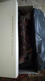 Stivali artigianali in pelle trattata per un effetto screpolato invecchiato con rose ricamate n. 36 di Alessandro D"Armando. Anche la fodera interna è in morbida pelle. Praticamente mai usati perché io porto un 35. Conservati nella loro scatola originale con le imbottiture e i gambali salva forma. All'interno dello stivale, sul tallone è possibile vedere ancora il marchio color bronzo.