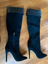 Tacco a spillo affusolato, punta sfilata, cerniera laterale (parziale). La parte superiore è risvoltabile, offrendo due look in uno (lunghezza standard con risvolto in ecopelle nero o stivale più lungo