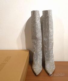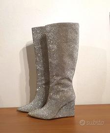 Spettacolari stivali alti al ginocchio, con tacco a zeppa, by Steve Madden Tomaia colore argento iridescente con strass all-over e tacco a zeppa N.38 Prezzo retail € 375,00 COMPOSIZIONE Fibre tessili MISURE Altezza del gambale 39 cm Circonferenza gambale 41 cm Altezza tacco 10 cm DETTAGLI Stivali Tinta unita con applicazioni Materiale sintetico, Interno foderato, Suola in gomma Punta stretta Zeppa Cristalli