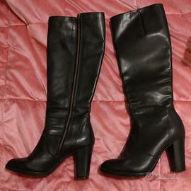 Stivali in vera pelle nera, morbidi e resistenti, lunghezza appena sotto il ginocchio.