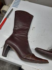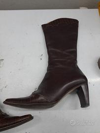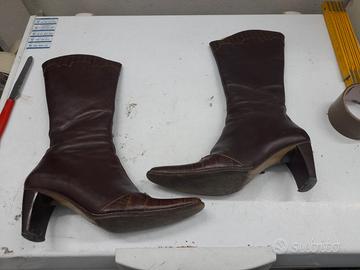 Stivali alti marroni con tacco. Presentano una punta affusolata e una chiusura laterale con zip.