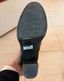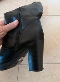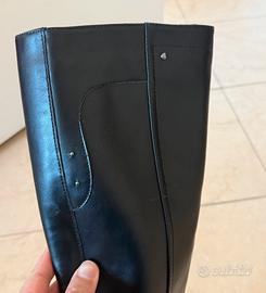 Vendo splendido paio di stivali alti al ginocchio in ecopelle nera, ideali per la stagione autunno/inverno. Questo modello unisce eleganza e comfort grazie alla combinazione di tacco alto e plateau. • Design: Stile classico e pulito. Gli stivali sono alti fino al ginocchio. Presentano una pratica cerniera interna a tutta lunghezza per facilitare la calzata e un piccolo inserto elastico a V sul retro del polpaccio per una migliore vestibilità (vedi foto). Sul lato esterno sono presenti alcuni dettagli ornamentali argentati a forma di piccoli bulloni/perni. • Tacco e Comfort: • Tacco: Alto e largo (modello a blocchetto), offre ottima stabilità. Misura circa 10 cm (vedi foto con metro). • Plateau: Presente sotto la pianta del piede, riduce l'inclinazione del piede e rende la calzata più comoda nonostante l'altezza. • Specifiche: • Numero: 37 (come indicato sulla suola). • Materiale: Ecopelle/Poliuretano. • Fodera: Rivestimento interno morbido e pulito in tessuto. • Stato dell'oggetto: Usati pochissimo. Lo stato è impeccabile: l'ecopelle è perfetta senza graffi o segni, la suola è pulita (presenta ancora le etichette originali, vedi foto). Questi stivali sono perfetti per essere abbinati a vestiti, gonne o pantaloni skinny, adatti sia per un look da giorno che da sera.