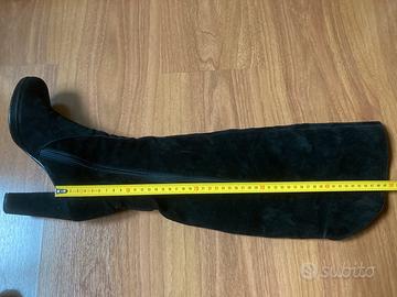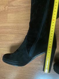 Stivali donna in tessuto effetto scamosciato, con gambali alti fino al ginocchio, più bassi leggermente nella parte posteriore, con possibilitá di risvolto. Chiusure lampo nella parte interna del gambale, tacco cm 9, plateau cm 1. Indossati solo una volta. Tacchi di ricambio in plastica. Senza scatola originale.