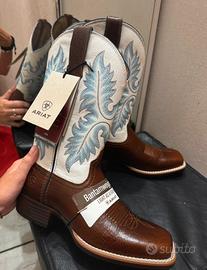 Stivali monta western Colore marrone con gambale bianco e ricami azzurri in stile western. Realizzati in pelle, molto leggeri e comodi Numero 38 Usati poco, vendo per cambio disciplina