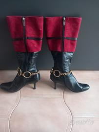 Stivale bicolore realizzato in morbida ed elegante pelle liscia e camoscio rosso.Chiusura laterale con zip. Il modello slancia ed esalta la figura femminile grazie al suo tacco alto a stiletto ed è perfetto per regalare un tocco di originalità e classe ad ogni look sia di giorno, sia di sera.