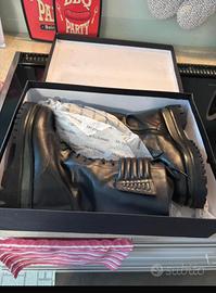 Con cerniera laterale, lacci, e dettaglio a strappo laterale.