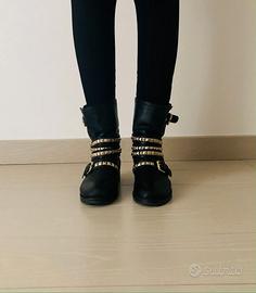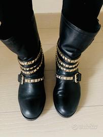 Stivali Biker Elisabetta Franchi Pelle nera con inserti metallo dorato. Taglia 36 vestibilità 37 scarso.