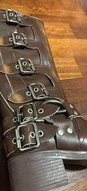 Stivale Marrone, pelle, chiusura con fibbia, punta tonda, altezza a mezzo polpaccio, tacco largo basso e suola in gomma.