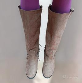 Stivali donna in pelle vegana color taupe con frange laterali in stile boho.