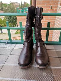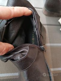 Color marrone scuro (testa di moro), hanno la pianta comoda e ampia, una cernierina laterale e fibbie con piccole borchie brunite. Il gambale è morbido come un guanto ed è adatto anche a polpacci forti. Taglia 39, indossati pochissimo.