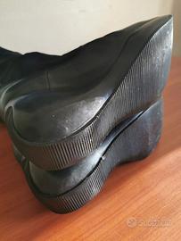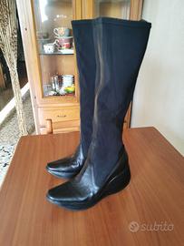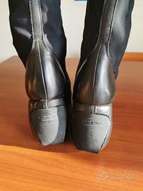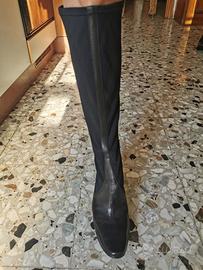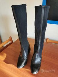 stivaletti a punta, numero 37. Il design combina la struttura in pelle nera con un gambale in tessuto elasticizzato effetto "sock boot Materiale: pelle nera e tessuto tecnico elasticizzato. Tacco: altezza circa 10 cm. Misura: 37 (EU) Pratica cerniera posteriore per una calzata agevole e veloce. Condizioni: Le scarpe sono in ottime condizioni complessive. La tomaia è integra e ben tenuta, e il tessuto elastico mantiene perfettamente la sua forma. Le suole mostrano i normali e lievi segni di utilizzo (come visibile in foto), ma i sottotacchi sono ancora in buono stato.