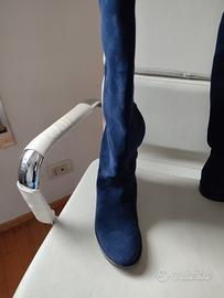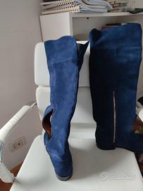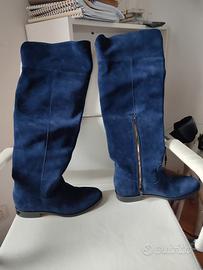 stivali fatti fare su misura da fillies & boots, misura 38 ma vestono un po' meno, tacco 2 cm., altezza dal tacco 55 cm. circonferenza esterna parte alta 42 cm. camoscio blu altezza sopra il ginocchio, cerniera su parte interna, mai usati, solo provati a casa. Preferibile incontro per vederli Mestre centro o porte di mestre