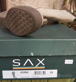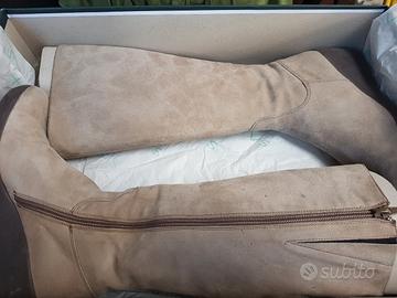 stivali al ginocchio camoscio (pelle) n 35 originali Sax colore tortora chiaro con cerniere tacco zeppa 6 cm scatola un po' rovinata usati pochissimo