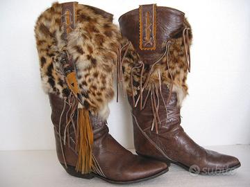 Stivali Camperos n.37 in cuoio con pelliccia di lince e riproduzione piccolo pugnale..e frange Vintage degli anni '70. Produzione El Vaquero - Milano