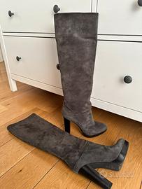 Stivali in camoscio grigio, si possono indossare sia alzati che morbidi a sbuffo.