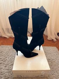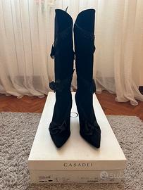 Stivali da donna Casadei art. 1713C in camoscio nero con dettagli in organza, tacco a spillo 10 cm, zip interna, modello luxury made in Italy elegante e ricercato, tg.37.5, mai utilizzato e con scatola originale (listino €590)