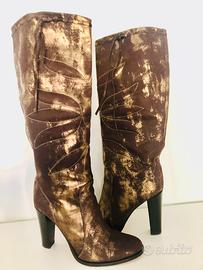 Stivali marroni e oro con tacco alto Pochette doppia abbinata Tutto PATRIZIA PEPE