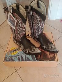 Stivali Country Primeboot n.40, ma ideale per chi veste solitamente scarpe n. 39. Sono in cuoio, di colore nero con punta bianca e decoro rosso. Provati 1 volta, ancora con etichetta e confezione completi. Utilizzabili come calzatura da esterno e/o ballo Country.