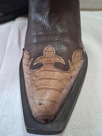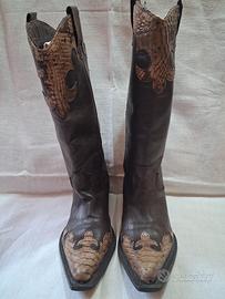 Bellissimi stivali da cowboy, vero pezzo d epoca ma in ottime condizioni,senza alcun difetto. Vera pelle marrone con inserti decoro coccodrillo, cuciture eccellenti. Taglia 38, ottima vestibilità,morbidi al tatto e indossati.Altezza compreso tacco 38 cm. Tacco 4 cm. Lunghezza dalla punta al tacco 28 cm.