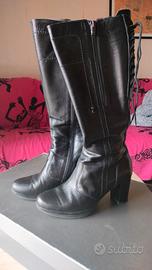 Stivali da donna marca Nero Giardini. Taglia 36 (io normalmente porto il 37 e mi vanno benissimo). In pelle nera. Alti sotto il ginocchio con zip laterale. Sul retro laccio per regolare la larghezza dello stivale. Tacco di 7 cm. Molto eleganti. Poco utilizzati e in ottime condizioni: suola poco usurata, cerniere del tutto funzionanti, pelle solo leggermente graffiata sulle punte.